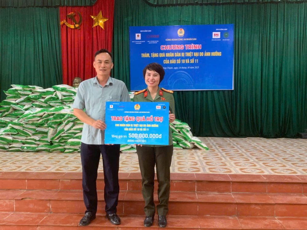 Responding to the call of the Central Committee of the Vietnam Fatherland Front, the launching ceremony of the Ministry of Public Security and Official Letter No. 8704/X03-P1 of X03 on launching support for people, officers and soldiers affected by storms and floods, the People's Public Security Trade Union organized activities to visit and give gifts to people in Da Hoi village, Hop Thinh commune.