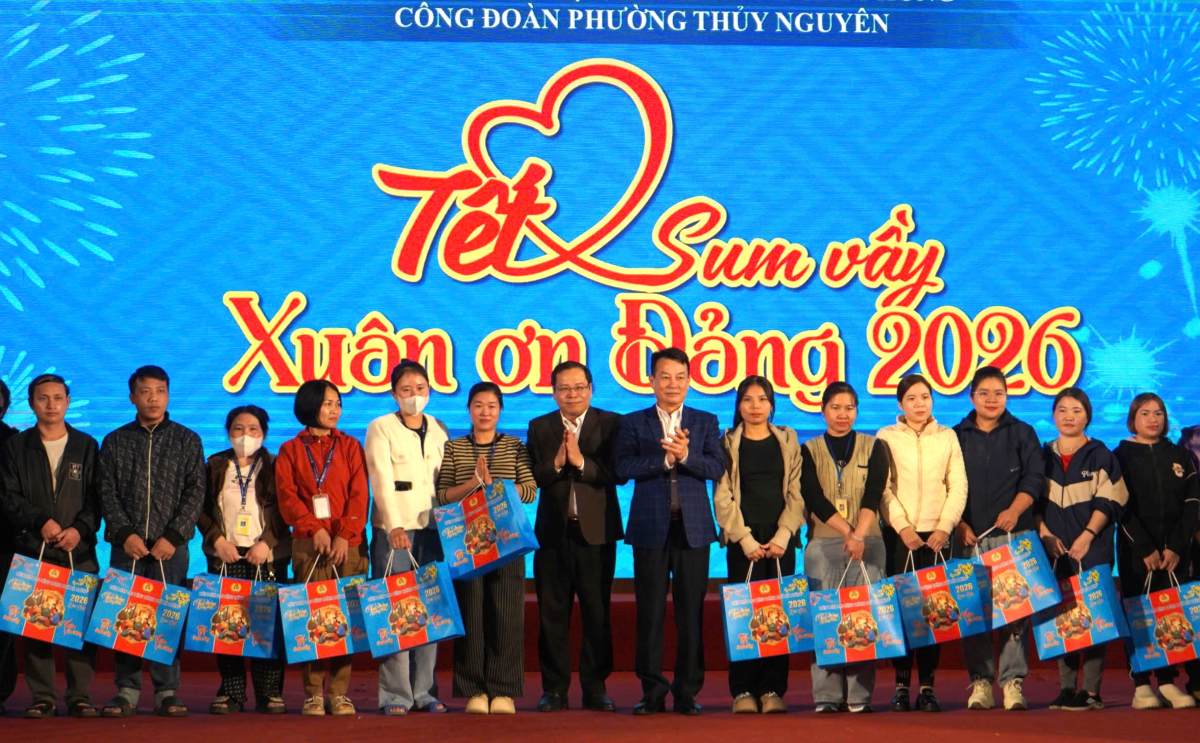 After the summary conference, the Ward Trade Union organized the Tet Reunion - Spring Gratitude to the Party 2026 program. A large number of union members and workers in the area enjoyed a unique art program, creating a joyful and exciting atmosphere to welcome the new spring. On this occasion, the Hai Phong City Labor Federation awarded a budget of 262.3 million VND to take care of Tet for union members and workers in Thuy Nguyen ward. Many gifts and allowances were handed directly to workers at the program.