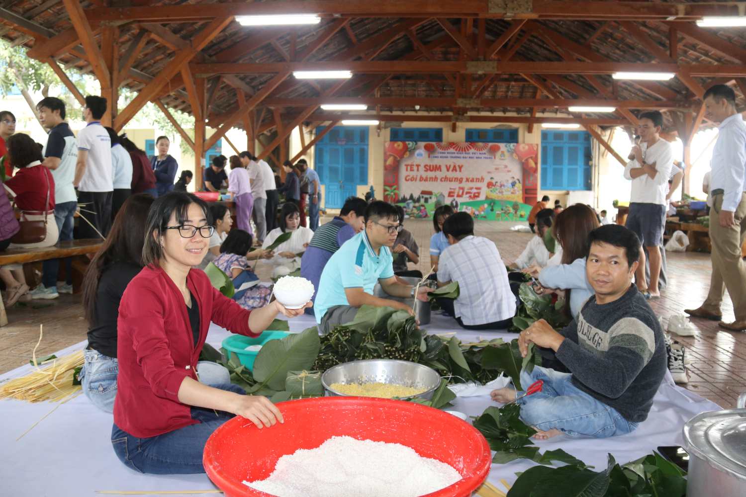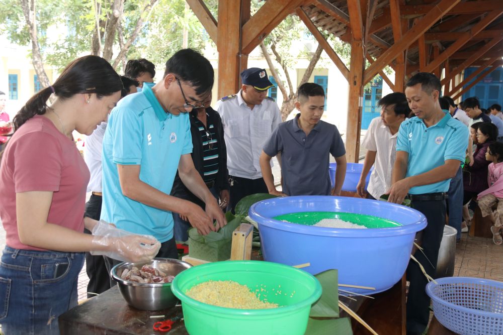 The highlight of the program is the banh chung wrapping activity with the participation of all departments, divisions, and centers directly under the school. The school's Trade Union prepares enough ingredients such as dong leaves, bamboo strings, sticky rice, green beans and pork.