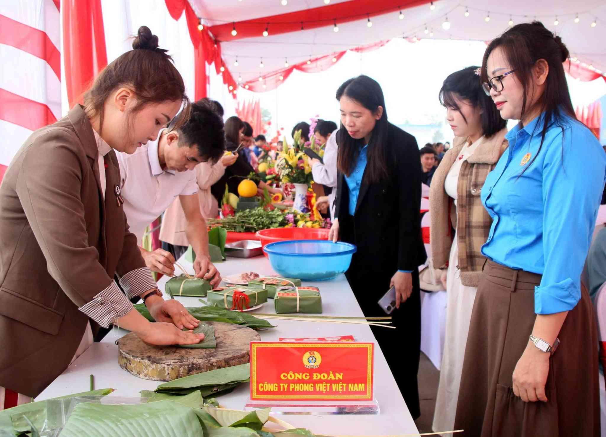 The program "Tet reunion - Spring of Gratitude to the Party" in 2026 is organized by Gia Van Commune Trade Union with many exciting activities, attracting a large number of workers to participate, especially the Chung cake wrapping contest and arranging five-fruit trays for Tet.