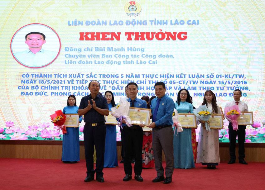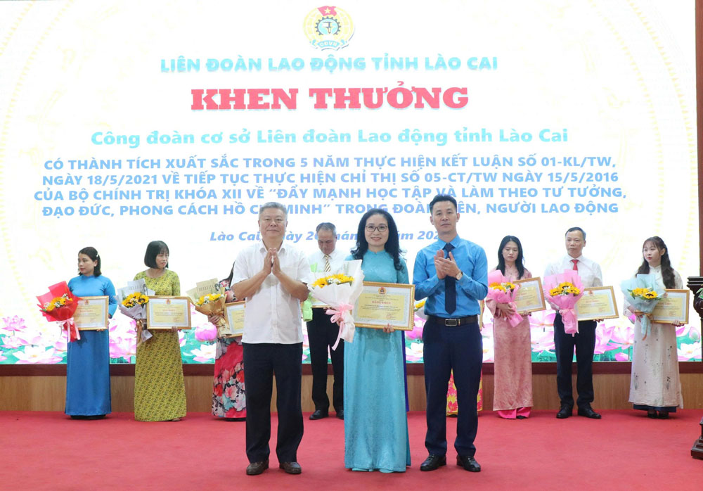 On this occasion, the Lao Cai Provincial Labor Federation awarded Certificates of Merit to 10 collectives and 7 individuals with outstanding achievements in implementing "Promoting studying and following Ho Chi Minh's ideology, ethics, and style among union members and workers" in the period 2021-2026.