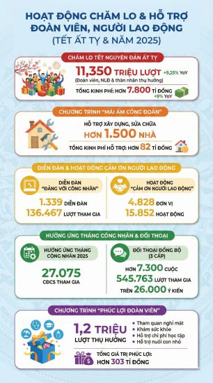 The Vietnam General Confederation of Labor advised and coordinated with the Vietnam Fatherland Front to organize and serve 195 delegations of leaders of the Party, State, Vietnam Fatherland Front, leaders of central departments, ministries and branches to visit, wish a happy New Year, and give gifts to union members, workers and laborers. There are nearly 21,000 "Tet Sum Vay - Xuan An Dang" programs organized, attracting nearly 6.1 million members and employees to participate, more than 2.3 million members and employees are given gifts at programs with a total amount of nearly 1,500 billion VND.