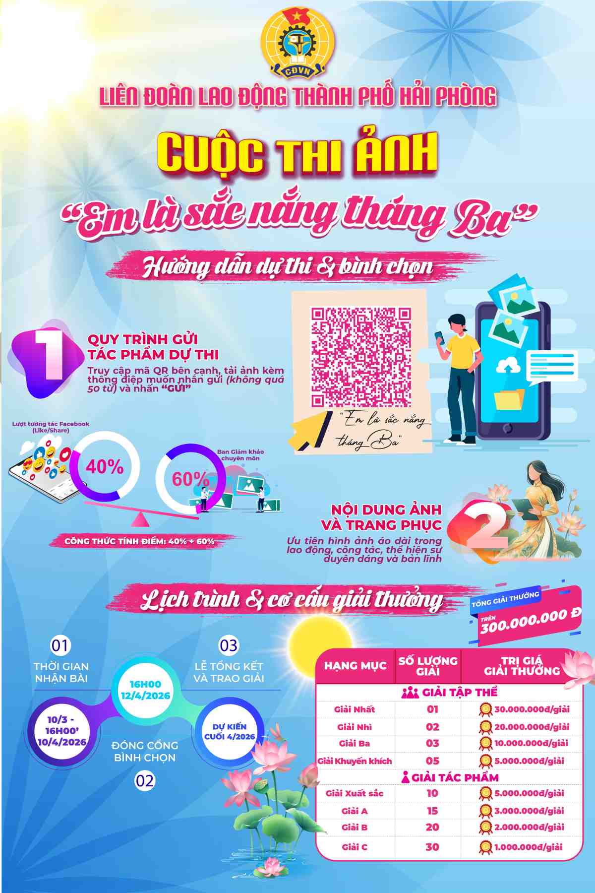 The online photo contest "You are the color of March sunshine" was launched by the Hai Phong City Labor Federation from March 6, receiving entries from March 10 to 4 pm on April 10; closing the Voting Portal at 4 pm on April 12. 4. The closing and award ceremony is expected to be held at the end of April 2026.