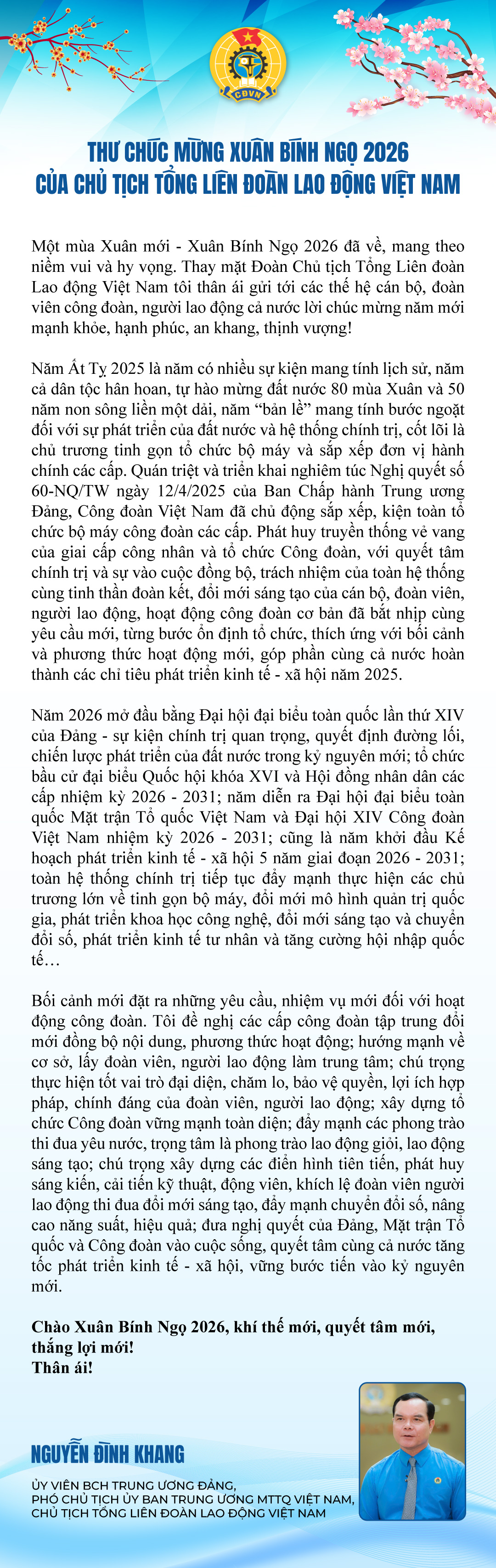 On the occasion of the country and nation joyfully welcoming the new Spring of Binh Ngo, Comrade Nguyen Dinh Khang - Member of the Party Central Committee, Vice Chairman of the Central Committee of the Vietnam Fatherland Front, President of the Vietnam General Confederation of Labor - sent a New Year greeting letter to all cadres, party members, employees, and laborers.