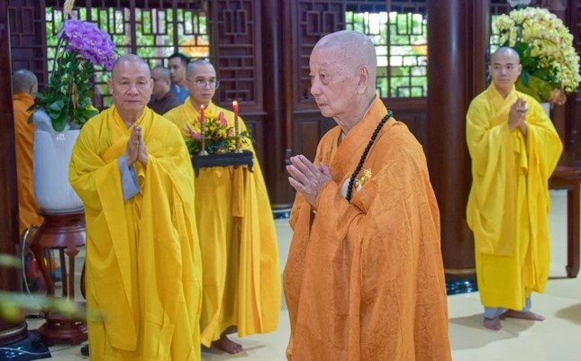 Dharma Master - Great elder Venerable Thich Tri Quang offers incense to commemorate Great elder Venerable Thich Tri Thu at Quang Huong Gia Lam, Hanh Thong ward.