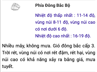 Dự báo thời tiết hôm nay 14.2, do ảnh hưởng của không khí lạnh kết hợp với hội tụ gió trên cao nên khu vực từ Thanh Hóa đến Thừa Thiên Huế có mưa, mưa rào. Bắc Bộ trời rét, vùng núi có nơi rét hại với nhiệt độ thấp nhất phổ biến 11-14 độ C, vùng núi 8-11 độ C, vùng núi cao có nơi dưới 6 độ C và có khả năng xảy ra băng giá, mưa tuyết.