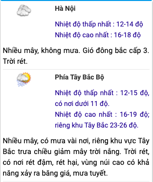 Dự báo thời tiết hôm nay 13.2, do ảnh hưởng của không khí lạnh kết hợp với hội tụ gió trên cao nên Bắc Bộ có mưa, mưa rào và có nơi có dông, cục bộ có mưa vừa, mưa to với lượng mưa 30-50mm, có nơi trên 70mm. Trời tiếp tục rét đậm, vùng núi có nơi rét hại với nhiệt độ thấp nhất phổ biến 11-14 độ C, vùng núi 8-11 độ C, vùng núi cao có nơi dưới 6 độ C.
