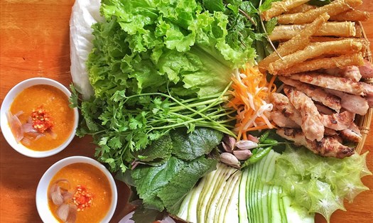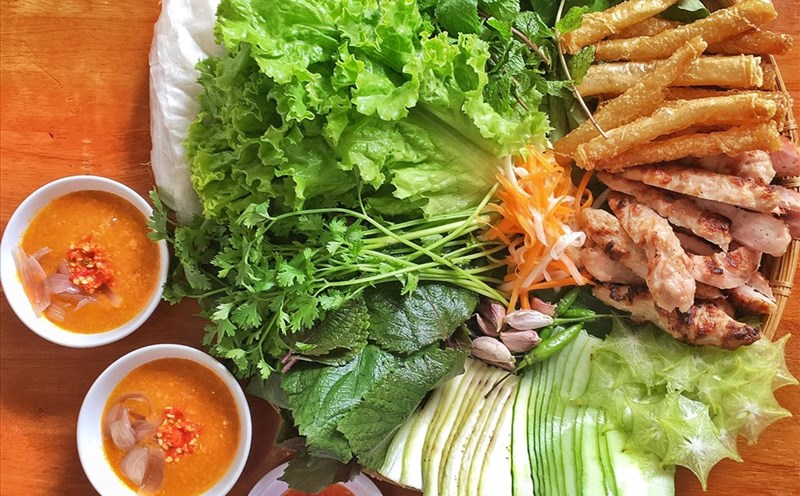 Nem nướng là món ăn nổi tiếng nhất định phải thử khi đến Nha Trang để cảm nhận hương vị khác biệt, đặc trưng tại đây. Nem nóng mềm, dai mà không hề bị khô, khi ăn thì cuốn cùng bánh tráng, ram, rau, nộm chua từ xoài, cà rốt, củ cải và bún tươi. Điểm nhấn của món ăn này là nước chấm có cách pha riêng, sền sệt, vị vừa ăn mà đủ để dậy thêm phần đậm đà cho nem.