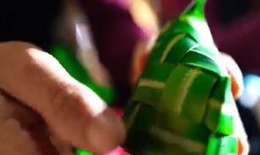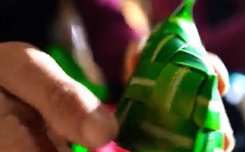 Sau công đoạn này, người thợ khéo léo múc nước bột đường sền sệt đổ vào một cái đài được làm bằng lá chuối tươi và dùng tăm tre vót nhọn ghim kín mép lá.