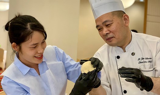 The ingredients are mixed well, then when shaping the cake, lotus seeds and Chinese sausage are placed in the middle and then the filling is shaped. With skillful hands, the craftsman skillfully uses a thin layer of dough to wrap the filling, roll it into a ball and put it into the molding machine to shape it.