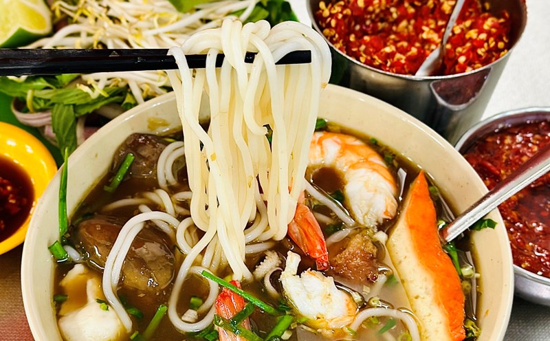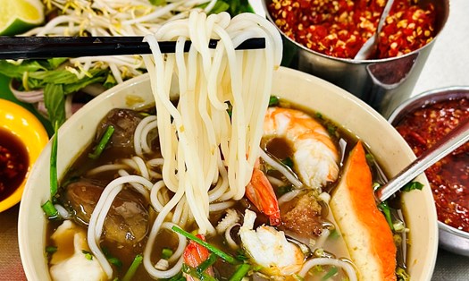 Ngoài xương, người nấu còn dùng cả nước tôm luộc để lấy vị ngọt thanh, đậm đà và mùi hải sản đặc trưng. Thực khách có thể ăn bún tôm kèm với chả lá lốt, chả cá, mộc nhĩ thái chỉ.