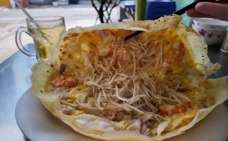 The cake is poured thinly and crispy, filling with shrimp, meat and stir-fried pork floss, served with spicy mustard greens. Diners roll the cake with vegetables and dipping in sweet and sour fish sauce, creating a balance between fatty, crispy and refreshing flavor. Each portion of the cake costs about 175,000 VND, enough for 2 to 3 people to have a snack.