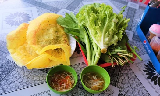 Banh xeo here has tops of onions, shrimp, pork, bean sprouts... with a thickly coated crust. A special banh xeo costs 180,000 VND. The cake is served with lots of raw vegetables and sweet and sour fish sauce.
