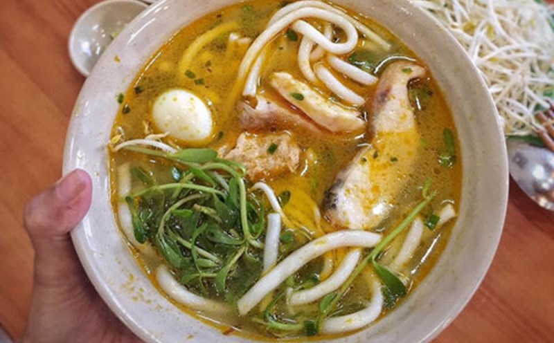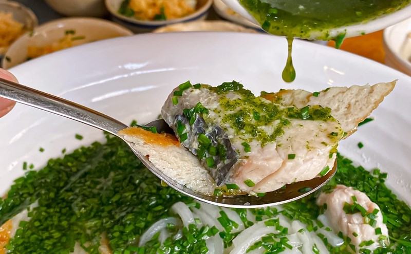 Bánh canh mềm dai cùng với nước lèo thơm lừng, chả cá chiên và thịt cá ngon không gì bằng nhất là khi ăn kèm với rau trụng cùng chút nước mắm ngon. Bánh có màu xanh đặc trưng của hẹ.