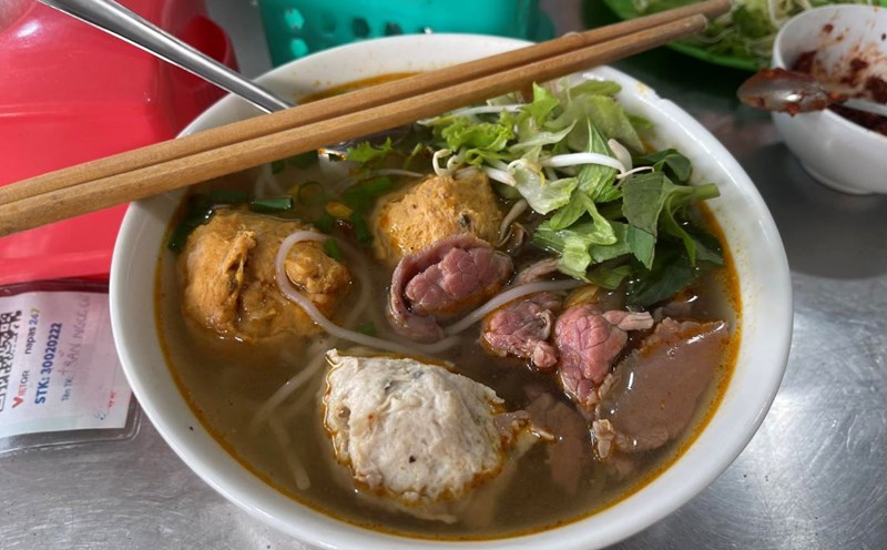 A full bowl of Hue beef noodle soup includes beef and crab meatballs, beef, sliced blood and a piece of pork leg. The broth at the restaurant is simmered from beef and pork bones along with pineapple, lemongrass and many other spices. In particular, the highlight of the broth is the characteristic shrimp floss flavor. The broth is simmered for at least 18 - 24 hours.