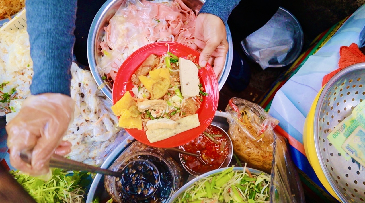Gánh hàng ăn bán đủ loại mì, bún, nui… tại góc phố Mạc Đĩnh Chi giao Nguyễn Thị Minh Khai, TPHCM là địa chỉ quen thuộc nhiều thực khách vào mỗi sáng sớm.