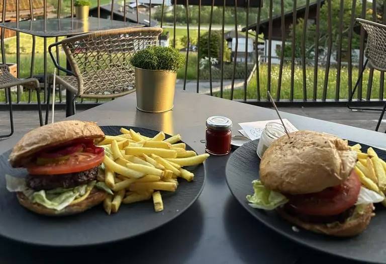 The Burger is displayed on a special dish of lacquer, fried potatoes contained in a basket of red fried dough sticks, a typical feature of Vietnamese street food.