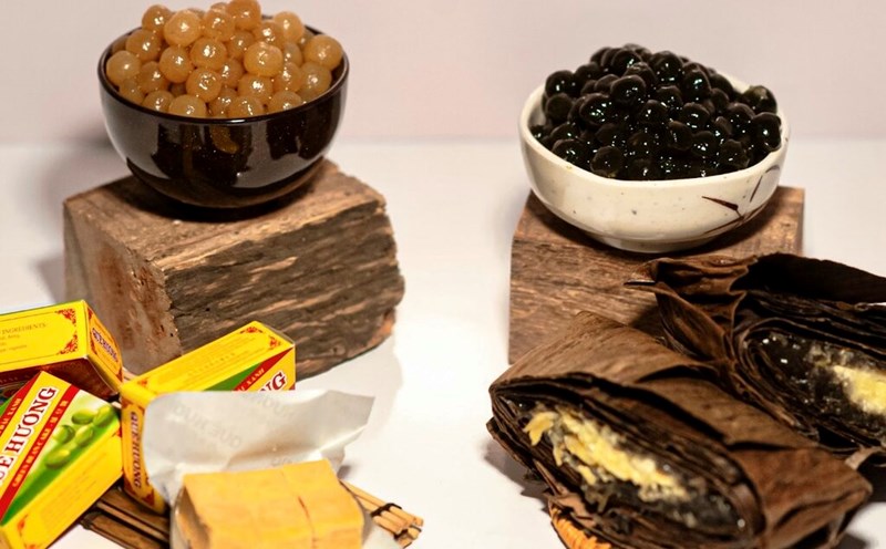 Unique pearl milk tea with gai cake and green bean cake from Hai Duong