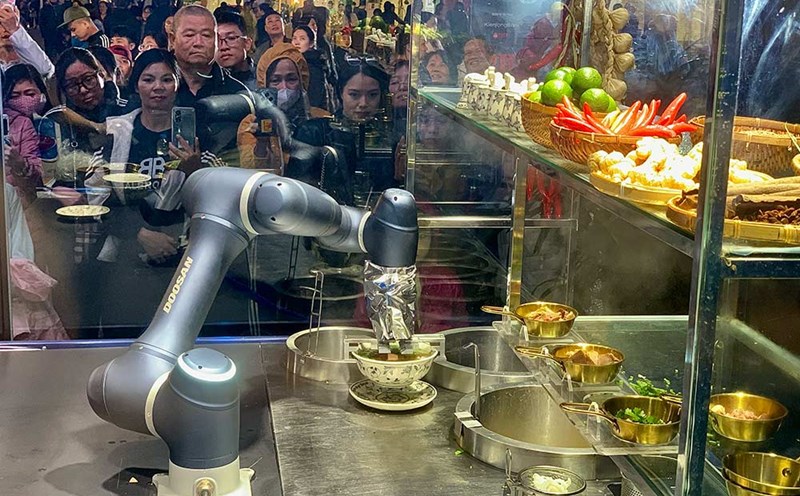 A large number of diners watch and wait for their turn to enjoy "Pho so" served by robots at the Hanoi Food Culture Festival 2024.