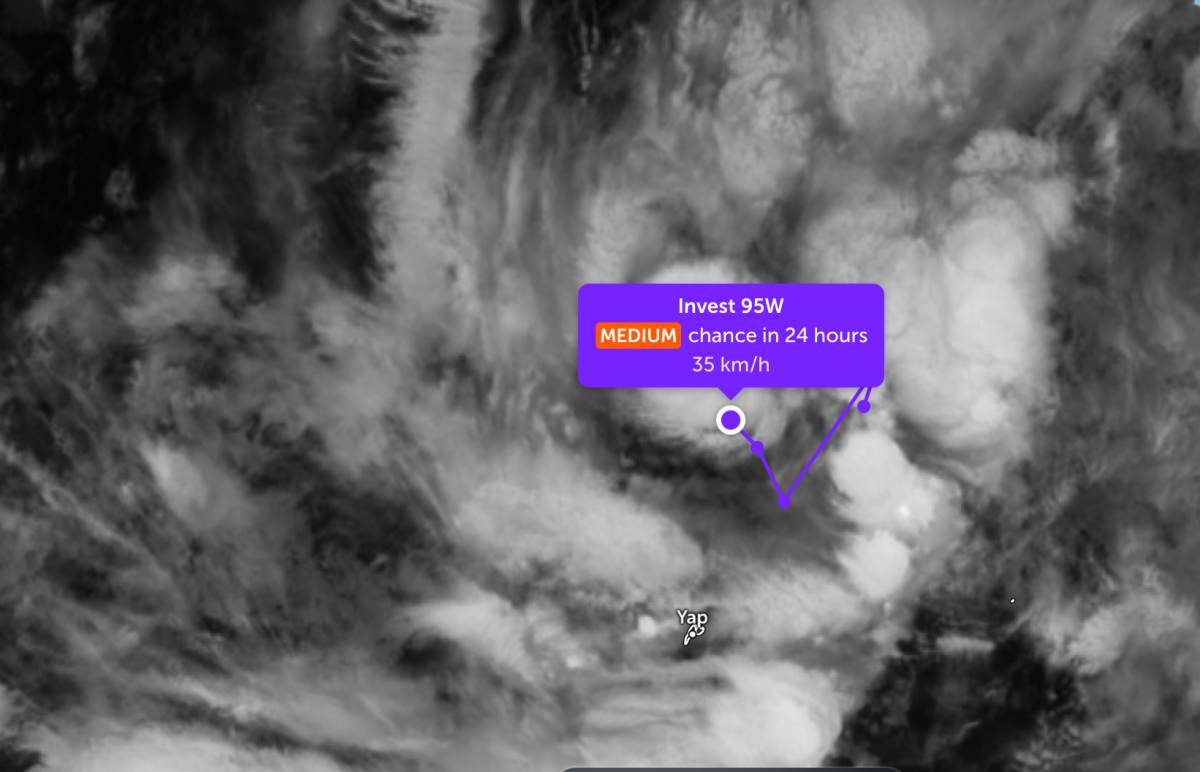 The low pressure bearing the symbol Invest 95W is located at 10.4 degrees North latitude - 138.5 degrees East longitude, about 1,425 km northeast of Mindanao.
