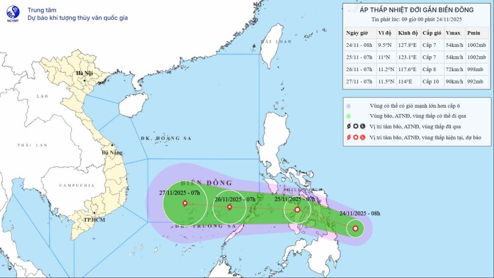 It is forecasted that by November 26, the tropical depression will move westward at a speed of about 20-25 km/h, entering the East Sea.