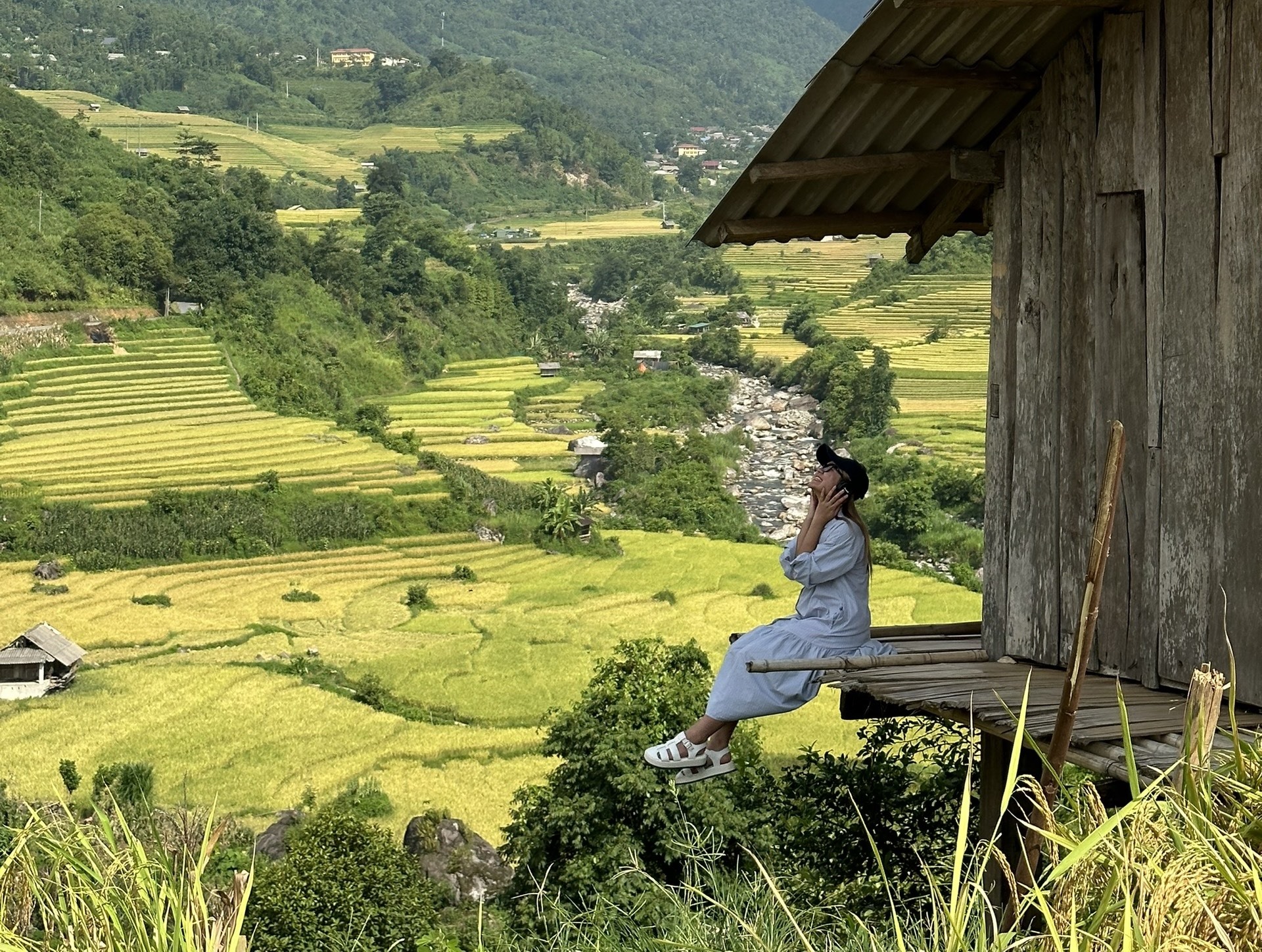 Năm nay mùa lúa chín ở Nậm Cang sớm hơn mọi năm, Thùy Dương kịp ghé Sa Pa, Lào Cai để ngắm nhìn những ruộng bậc thang vàng ruộm đầu mùa.