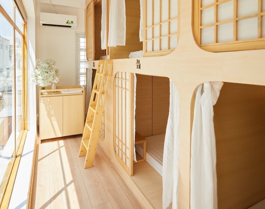 Không gian quán rộng rãi, có 3 tầng. Tông màu chủ đạo là trắng và nâu cam ấm áp, kết hợp tinh tế. Ngay khu vực cửa vào quán trồng rất nhiều cây xanh, từ ban công tầng hai nhìn ra là đủ mướt mắt.