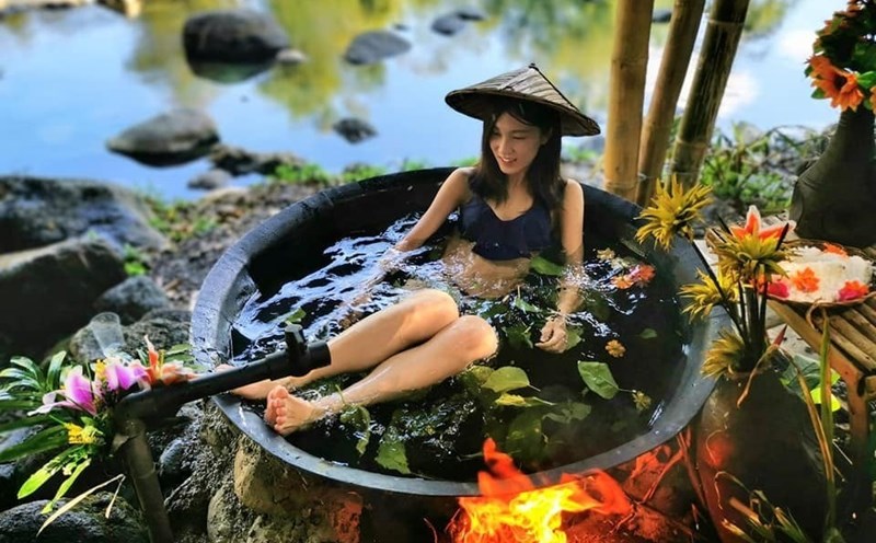 Du khách có thể vừa thưởng thức các món ăn nổi tiếng của quốc đảo Philippines như cà ri, cá nướng, trái cây nhiệt đới... bày trên tàu lá chuối, vừa ngâm chân và mát xa trong dòng nước mát lành dễ chịu.