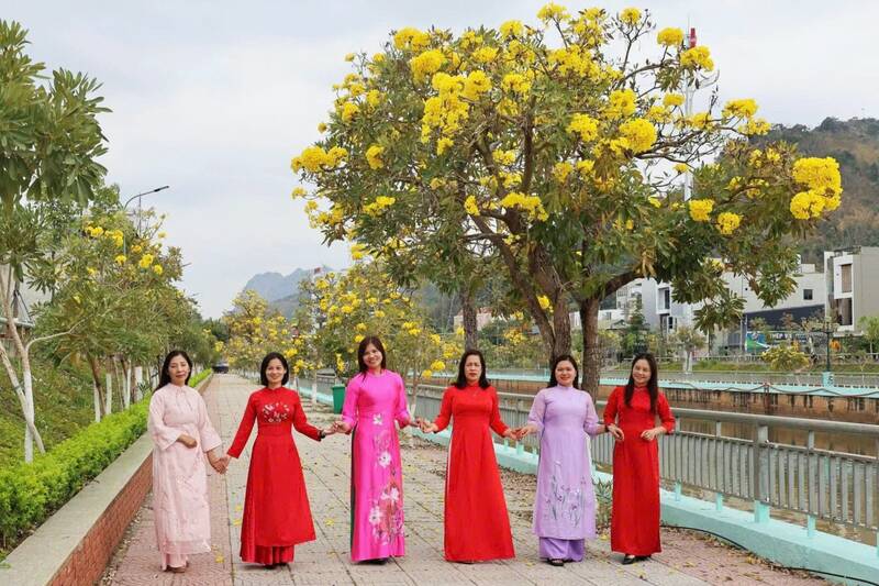 Many people choose to wear ao dai, Thai ethnic costumes to take photos with flowers. Ms. Pham Thi Hang, a tourist from Dien Bien, said that each Son La season has its own beauty, but the phong linh season impresses with its brilliant yellow color and poetic scenery.