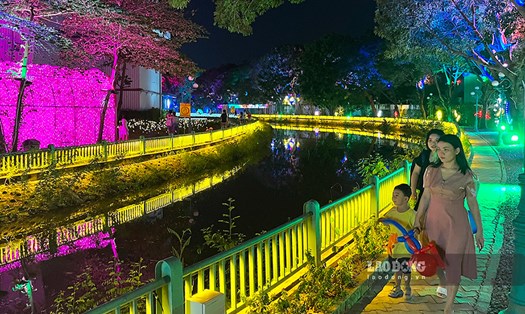 Lều cắm trại màu trắng, hình chóp xếp thành những hàng dài phía xa. Có một “chậu sắt” lớn mà Yến đoán dùng để đốt lửa trại buổi tối bên một hồ nước trong xanh. Khi hoàng hôn xuống, khách tham quan có thể chụp ảnh ven hồ.