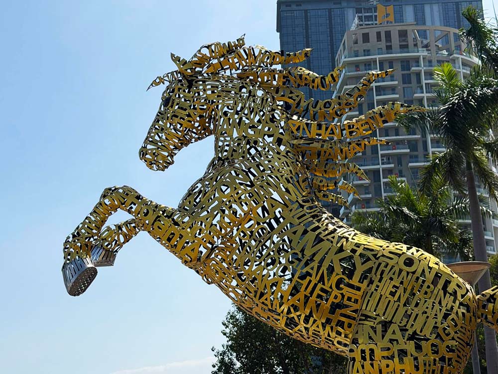 The mascot possesses a majestic size with specifications of 3.7m x 3.8m x 1.5m. The most unique point of the work lies in the artistic letter composition technique. The shape of the brave horse is composed of blocks of letters that are the name of Da Nang city and 94 commune-level administrative units after arrangement, including 23 wards, 70 communes and Hoang Sa special zone.