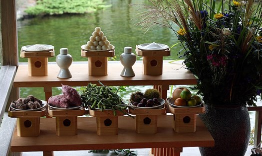 Gian bên trong là mâm cỗ Trung thu truyền thống của người Việt, với mâm ngũ quả, bánh nướng, đèn con cua, tò he... được bày biện cẩn thận.