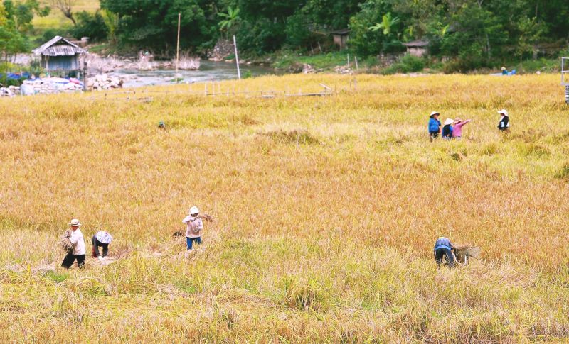 On the terraced fields, laughter echoes throughout the fields, the hands rolling to harvest rice, dry straw, beat rice... creating a vibrant yet peaceful life.