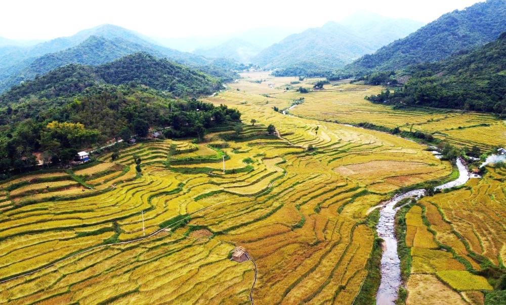 Looking down from above, the villages of the Thai, H'Mong, and Muong people are nestled in the valley, next to the golden rice fields winding around the mountainside, creating a peaceful and familiar country music.