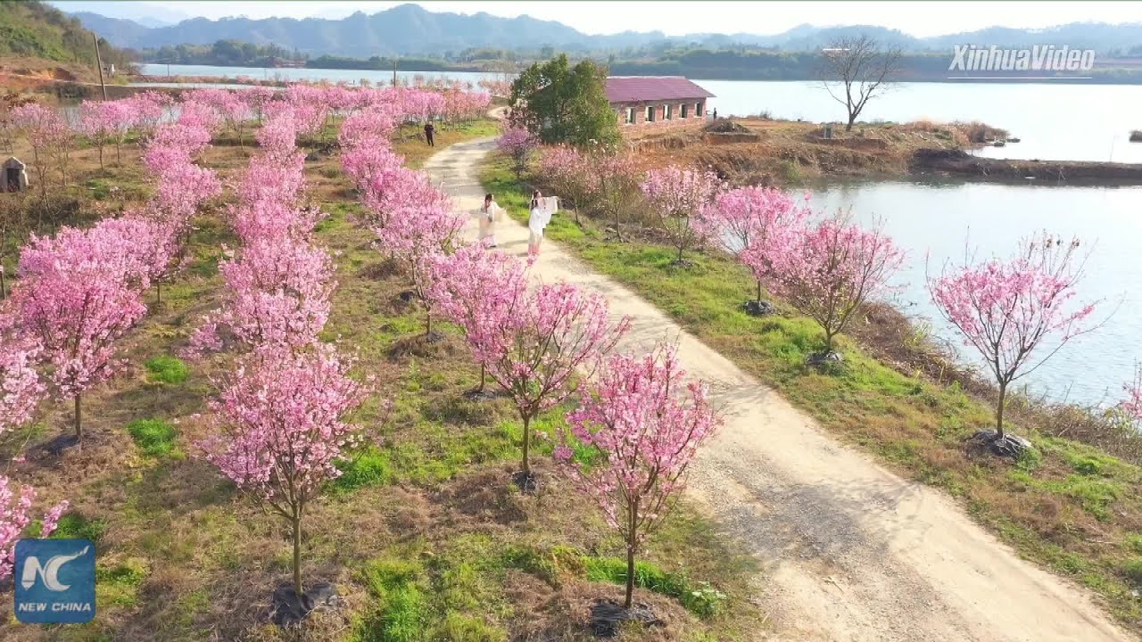 Thành phố Vũ Ninh thuộc tỉnh Giang Tây, Trung Quốc vào mùa xuân chìm trong sắc hồng rực rỡ của hoa anh đào.