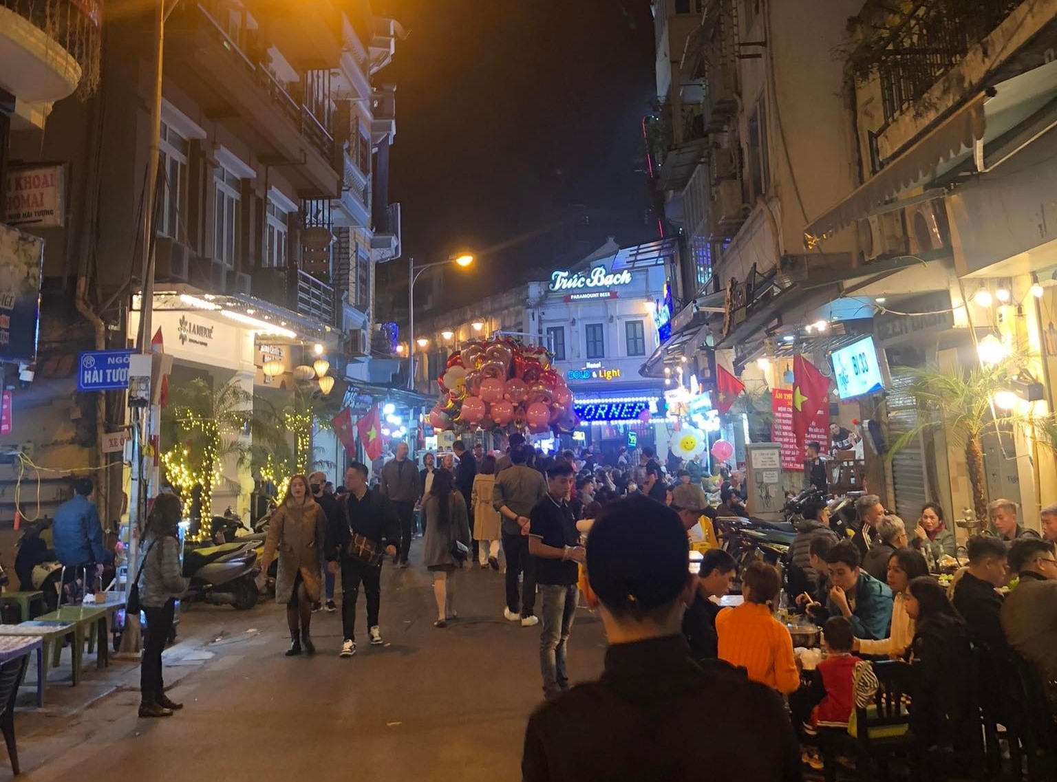Tối 1 Tết, đường phố Hà Nội đã trở nên đông đúc, tấp nập người đổ ra đường và các điểm tham quan ở Thủ đô để đi vui chơi, gặp gỡ đầu năm.