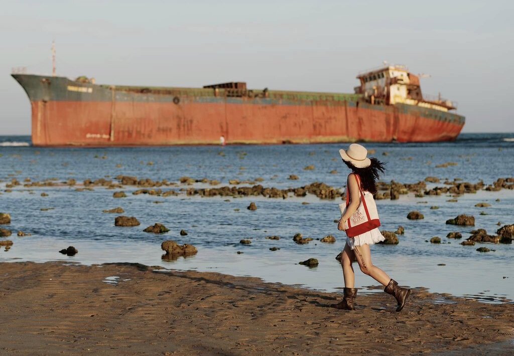 Ninh Thuan - Young people come to take photos with a boat drifting ashore in Bai Thong from 2023.