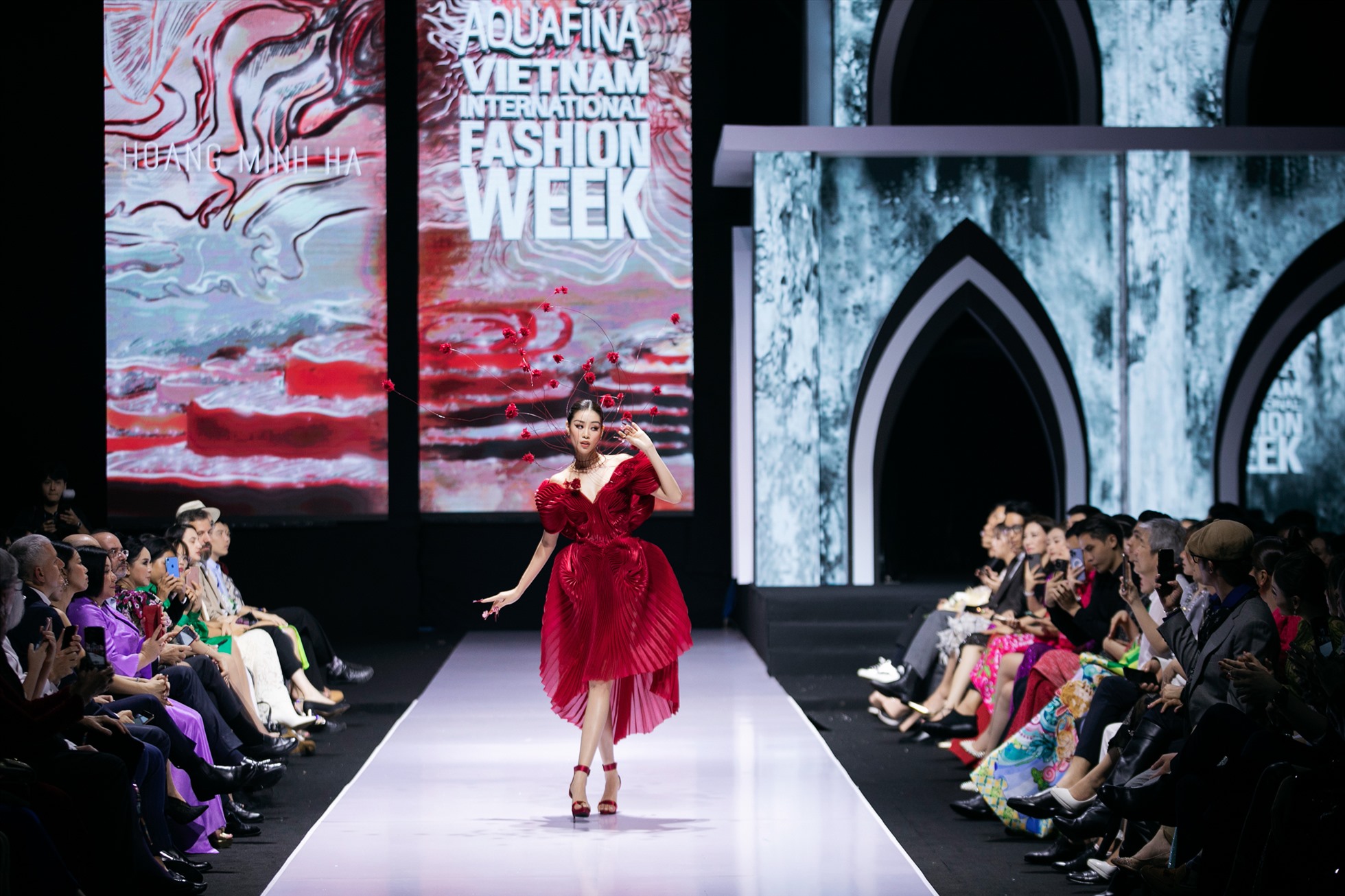 Lấy cảm hứng từ những phản chiếu của Hồ Gươm, ruộng bậc thang kết hợp cùng văn hoá Bắc Bộ, NTK Hoàng Minh Hà mang đến Tuần lễ Thời trang Quốc tế Việt Nam Thu Đông 2022 BST Sương qua phần trình diễn của hoa hậu Khánh Vân, Thanh Hằng.