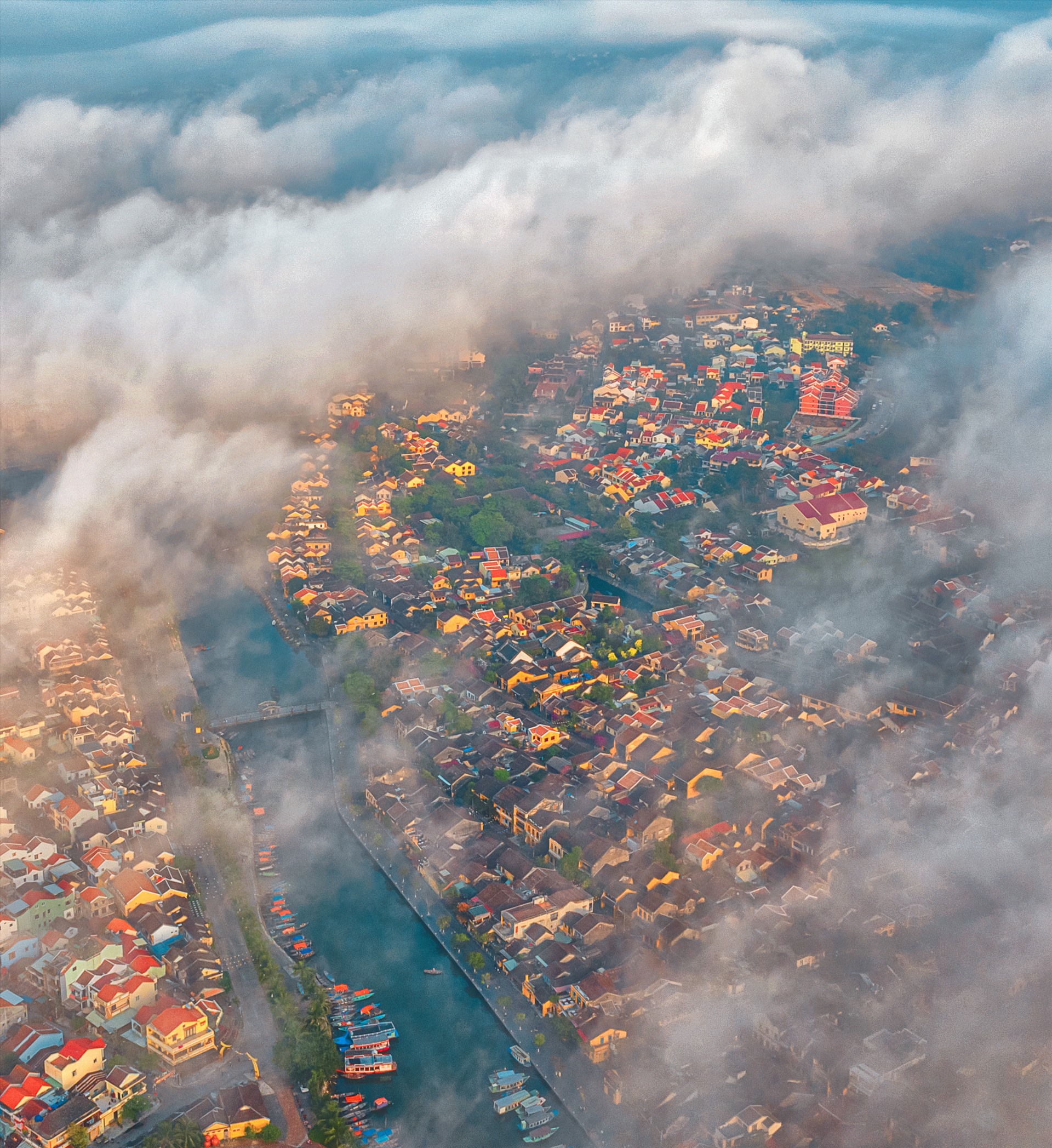 Trong loạt ảnh chụp từ trên cao của hai nhiếp ảnh gia Kim Liên và Thái Thiên Hồng Đào, bạn đọc có thể bất ngờ nhận ra một Hội An khác, bồng bềnh và huyền ảo trong mờ sương...