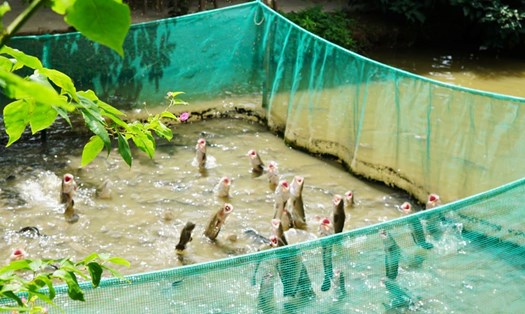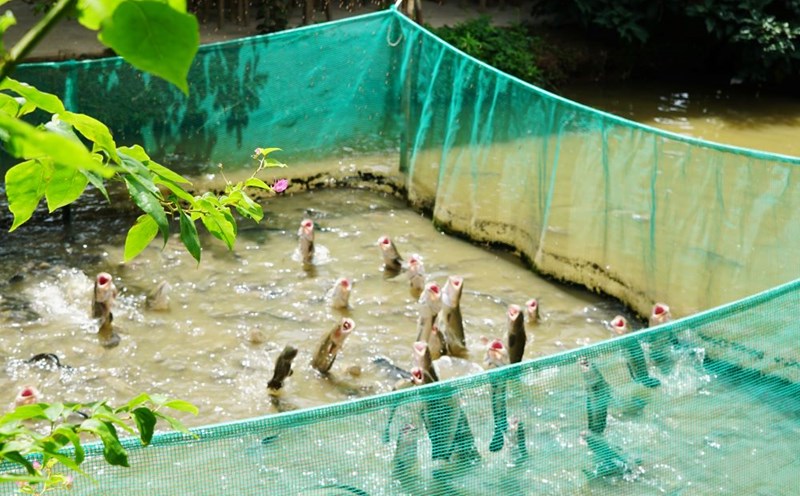 Những bè cá là điểm đến đầu tiên trong hành trình nửa ngày du ngoạn Cồn Sơn. Nơi đây sở hữu hơn 30 lồng bè lớn nhỏ với 12 loại cá khác nhau, trong đó có nhiều loài quý hiếm và đang có nguy cơ tuyệt chủng trên sông Hậu như cá chốt chuột, cá chạch lửa... Trong hình, du khách xem cá mê rổ phun nước săn mồi.