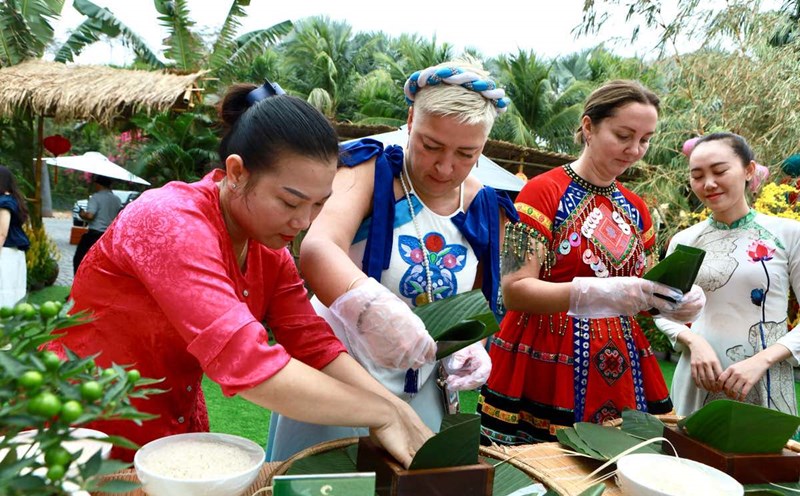 Binh Thuan - Tourists wrap banh chung and enjoy traditional Vietnamese specialties on the occasion of Lunar New Year in Phan Thiet.