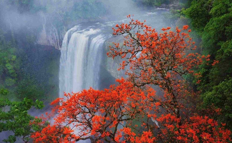 Gia Lai - K50 waterfall (or Hang En waterfall) is likened to a fairyland hiding in the old Kon Chu Rang forest, which is in the brilliant red corn flower season.