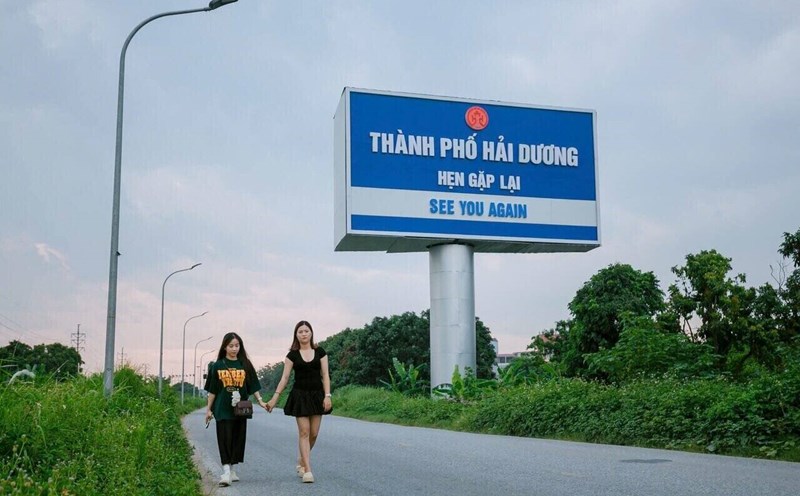 Hai Duong - Hai Duong people took the opportunity to check-in the gateway sign in front of this locality merging into Hai Phong.