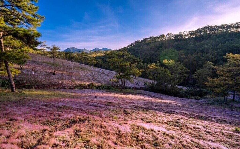 Lam Dong - Traveling to Da Lat at the end of the year, visitors will see pink grass hills sparkling in the morning mist, carpeted under green pine trees.