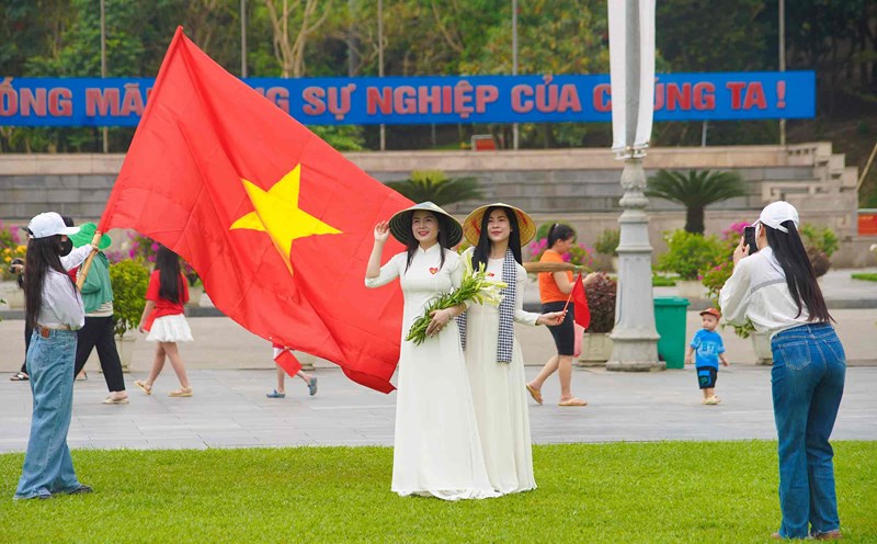 Nghe An - On April 27, people flocked to Ho Chi Minh Square (Vinh City) to offer flowers, incense and take souvenir photos on the occasion of the April 30 holiday.