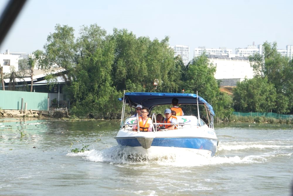 Người dân có thể trải nghiệm tuyến du lịch đường thủy nội đô bằng cano cao tốc. Đây là sản phẩm Quận 7 giới thiệu trong Tuần lễ Du lịch TPHCM năm 2023.