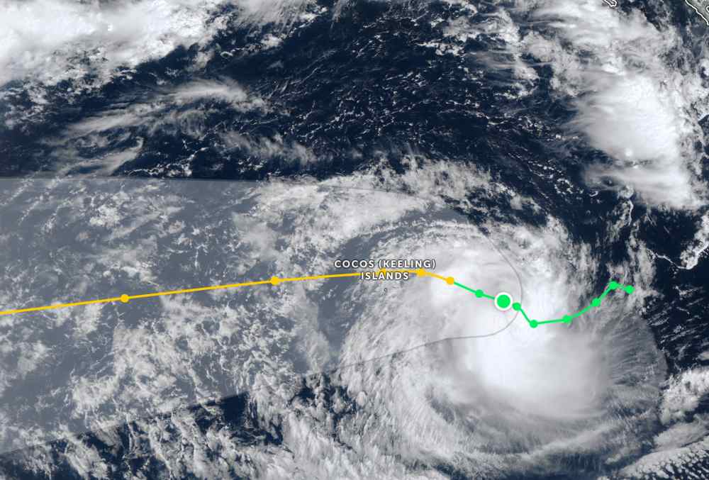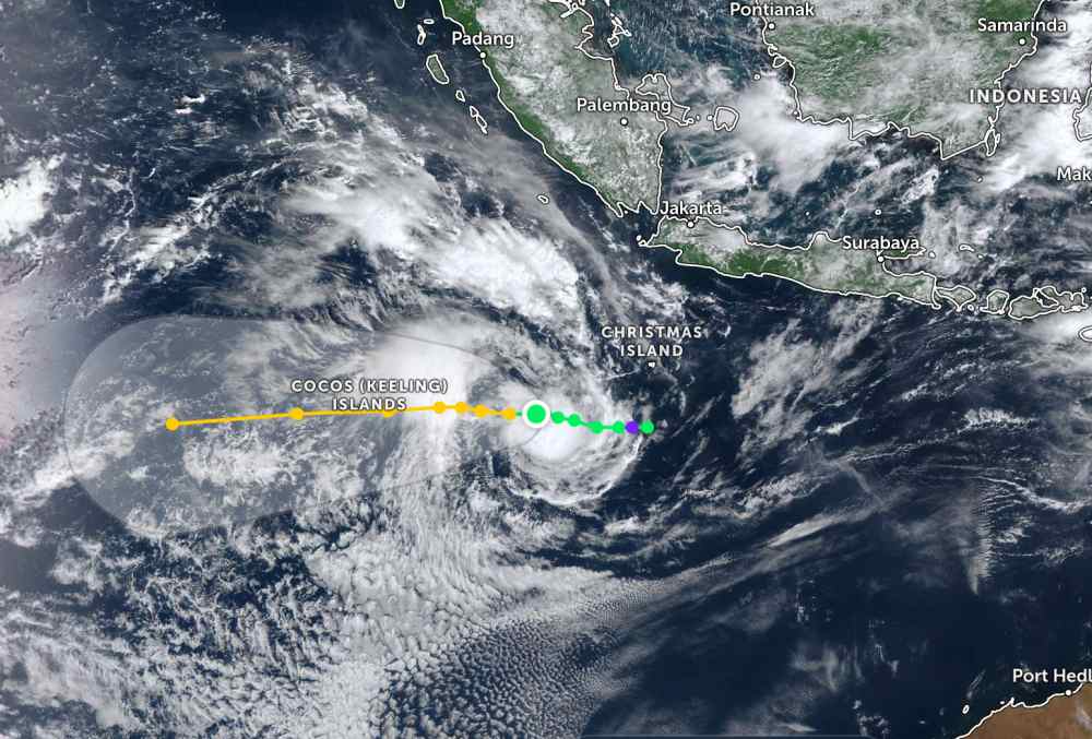 Typhoon Bakung is currently located about 594 km west-northwest of Cocos Islands in the South Indian Ocean.