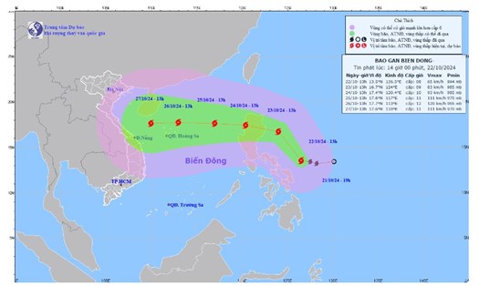 At 1:00 p.m. on October 24, the storm will move northwest and then change direction to west-southwest, 15-20 km/h, entering the East Sea. The intensity is level 9, gusting to level 11. The center of the storm is at about 16.7 degrees north latitude -119.8 degrees east longitude; in the eastern sea area of the North East Sea.