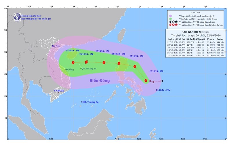 The storm is forecast to continue moving west-northwest at a speed of 10-15km/h at 1pm on October 25. The center of the storm is located at 17.2 degrees north latitude - 117.4 degrees east longitude; in the eastern sea of the North East Sea, 640km east of the Hoang Sa archipelago. The intensity is level 10, gusting to level 12.