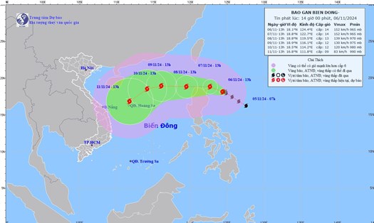 Forecast at 7:00 a.m. on November 8, storm Yinxing will move west, increase its speed to about 15 km/h and officially enter the East Sea. The center of the storm is located at about 18.5 degrees North latitude - 119.6 degrees East longitude, east of the North East Sea area. The strongest wind near the center of the storm is level 14, gusting to level 16. Disaster risk level: level 3 in the east of the North East Sea area.